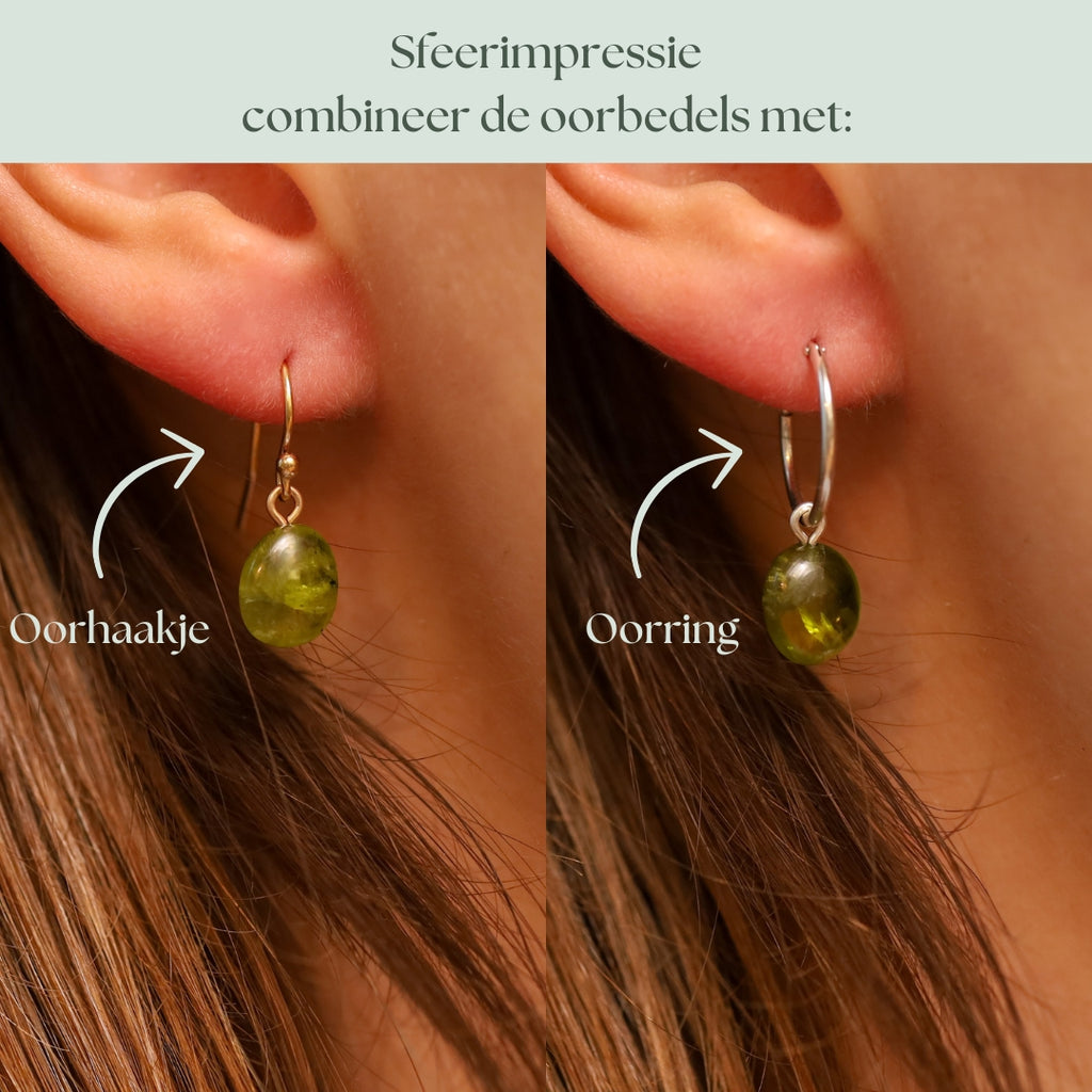 Van sommige edelstenen kunnen we mooie setjes oorbellen maken. We kiezen zorgvuldig twee edelstenen die goed bij elkaar passen, maar toch nét iets anders zijn. Elk setje is handgemaakt door ons. De oorbedels hebben een klein oogje, waardoor ze zowel met een oorhaakje als een oorring gecombineerd kunnen worden.