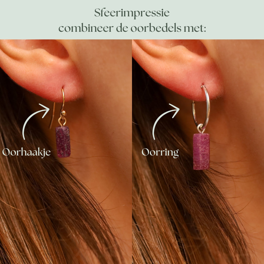 Van sommige edelstenen kunnen we mooie setjes oorbellen maken. We kiezen zorgvuldig twee edelstenen die goed bij elkaar passen, maar toch nét iets anders zijn. Elk setje is handgemaakt door ons. De oorbedels hebben een klein oogje, waardoor ze zowel met een oorhaakje als een oorring gecombineerd kunnen worden.