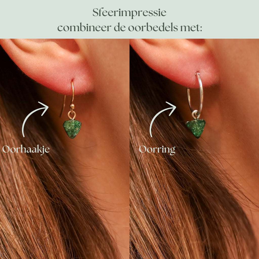 Van sommige edelstenen kunnen we mooie setjes oorbellen maken. We kiezen zorgvuldig twee edelstenen die goed bij elkaar passen, maar toch nét iets anders zijn. Elk setje is handgemaakt door ons. De oorbedels hebben een klein oogje, waardoor ze zowel met een oorhaakje als een oorring gecombineerd kunnen worden.