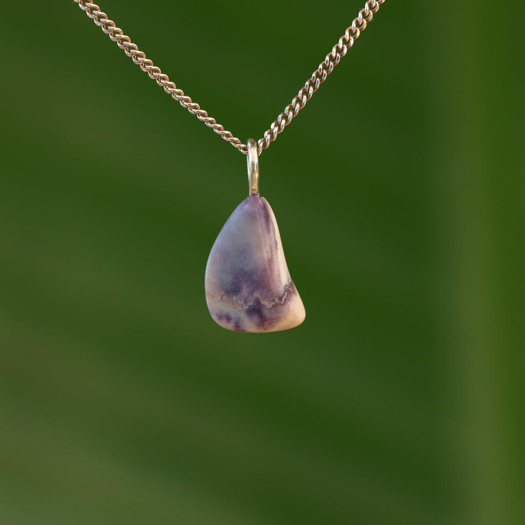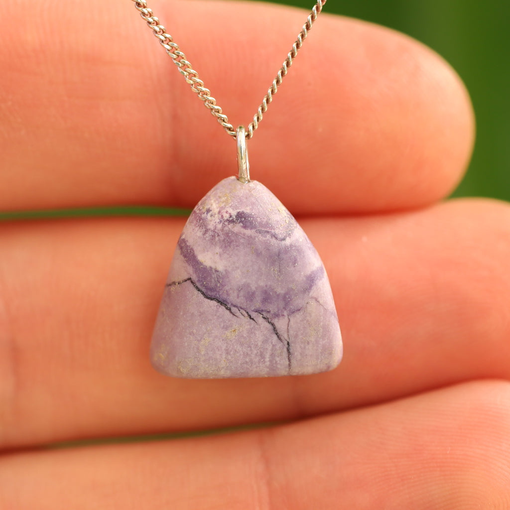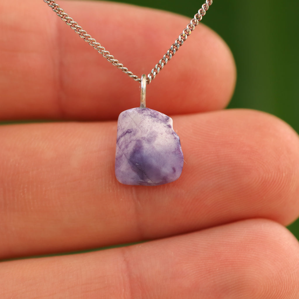 Tiffany stone is a rare mix of minerals that only occurs in Utah (USA). The purple hues come from fluorite, the white and cream from opal or calcite. Cloudy white/gray indicates chalcedony, pink or reddish spots are often rhodonite, and black veins are caused by manganese oxides. Each stone has a unique pattern of colors and textures.