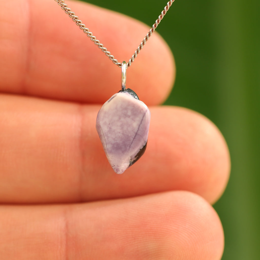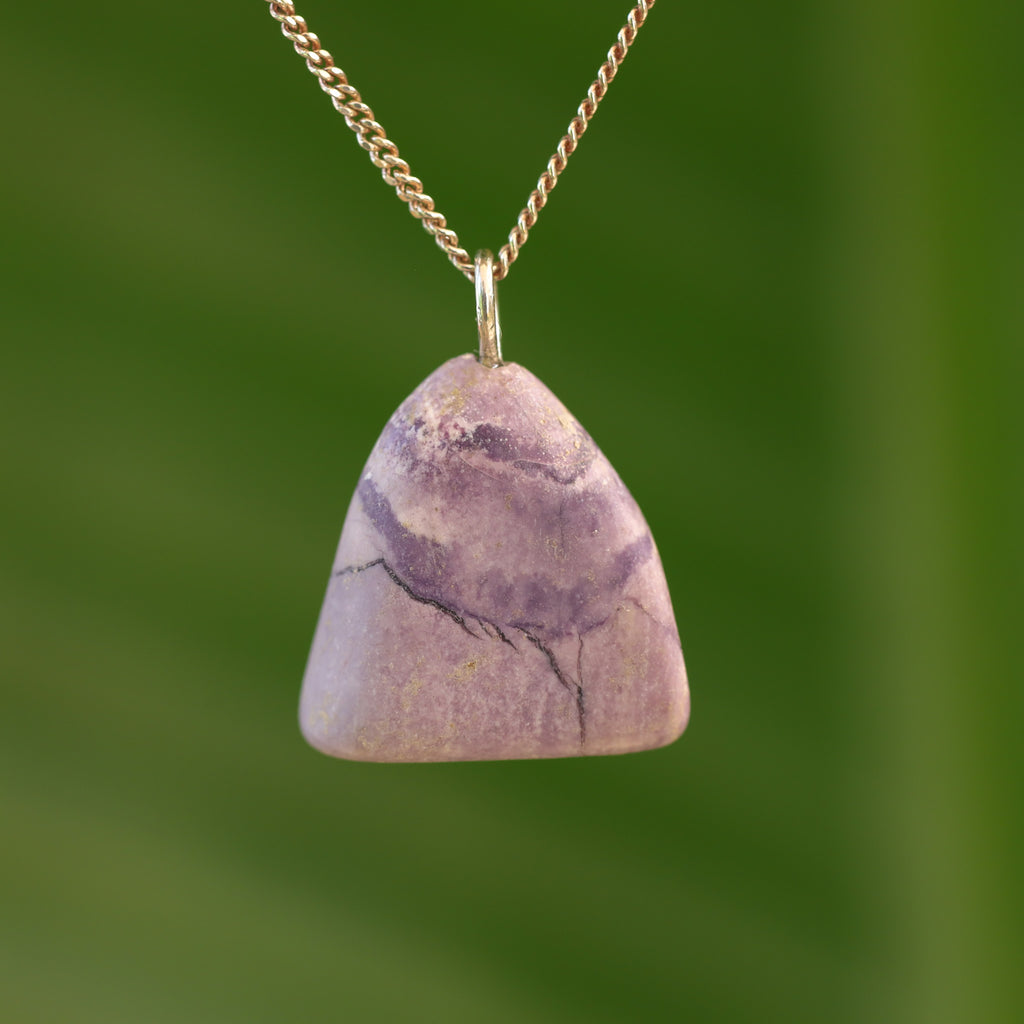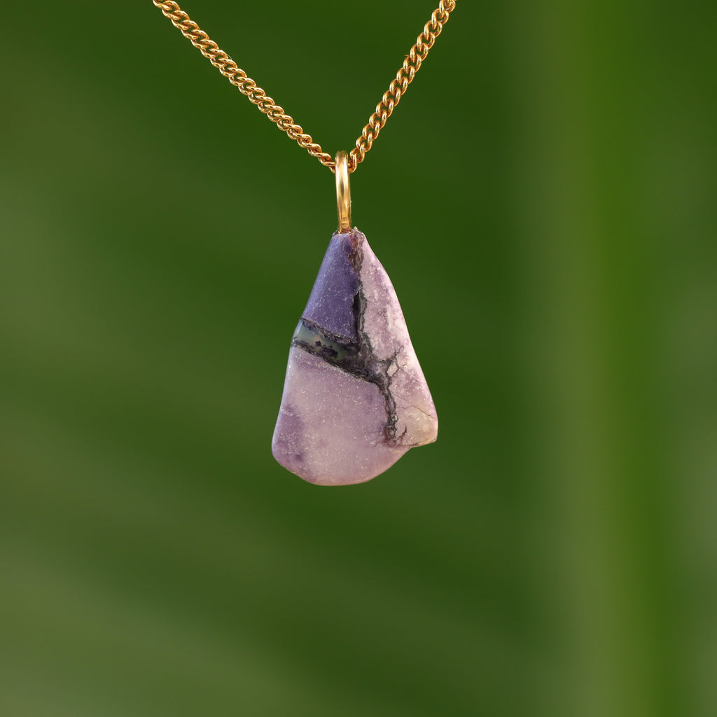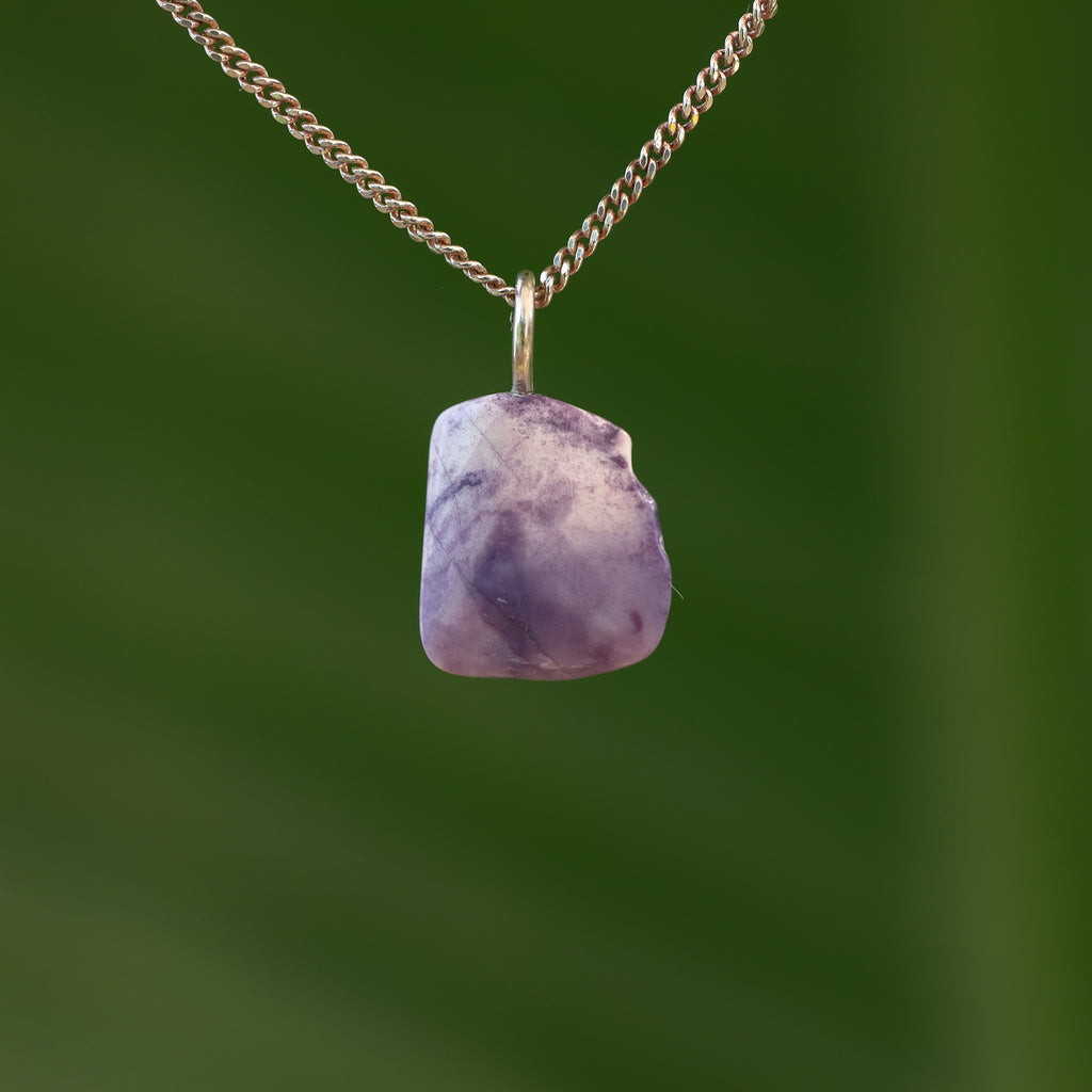 Tiffany stone is a rare mix of minerals that only occurs in Utah (USA). The purple hues come from fluorite, the white and cream from opal or calcite. Cloudy white/gray indicates chalcedony, pink or reddish spots are often rhodonite, and black veins are caused by manganese oxides. Each stone has a unique pattern of colors and textures.