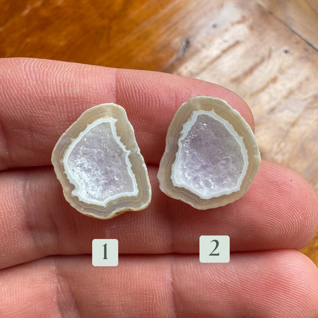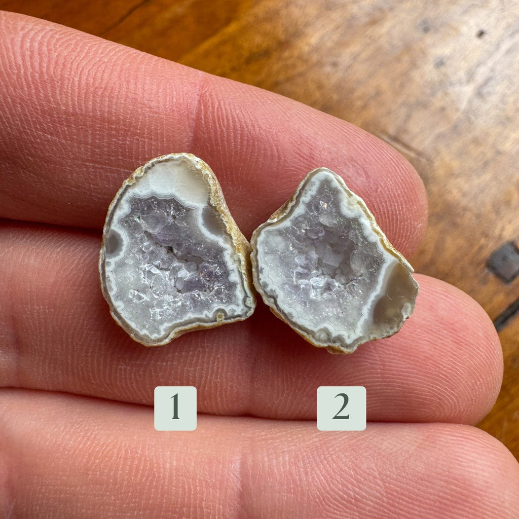 Une géode de quartz est une pierre creuse avec un extérieur rugueux et un intérieur cristallin. Il se forme lorsque l’eau riche en minéraux dans une cavité dépose des cristaux sur des millions d’années. L'intérieur est constitué de quartz clair mais peut également contenir des traces d'améthyste. La géode est sciée en deux, de sorte que chaque pendentif est en fait la « moitié » d'une géode de quartz entière.