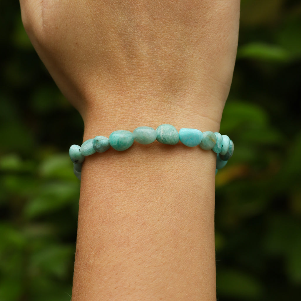 Deze edelsteen helpt bij verlatingsangst, bij nieuwe situaties en bij het nemen van afscheid. Hij laat je op een zachte en lieve manier aan een situatie wennen. Ook beschermt Amazoniet tegen straling en negatieve energie van buitenaf.