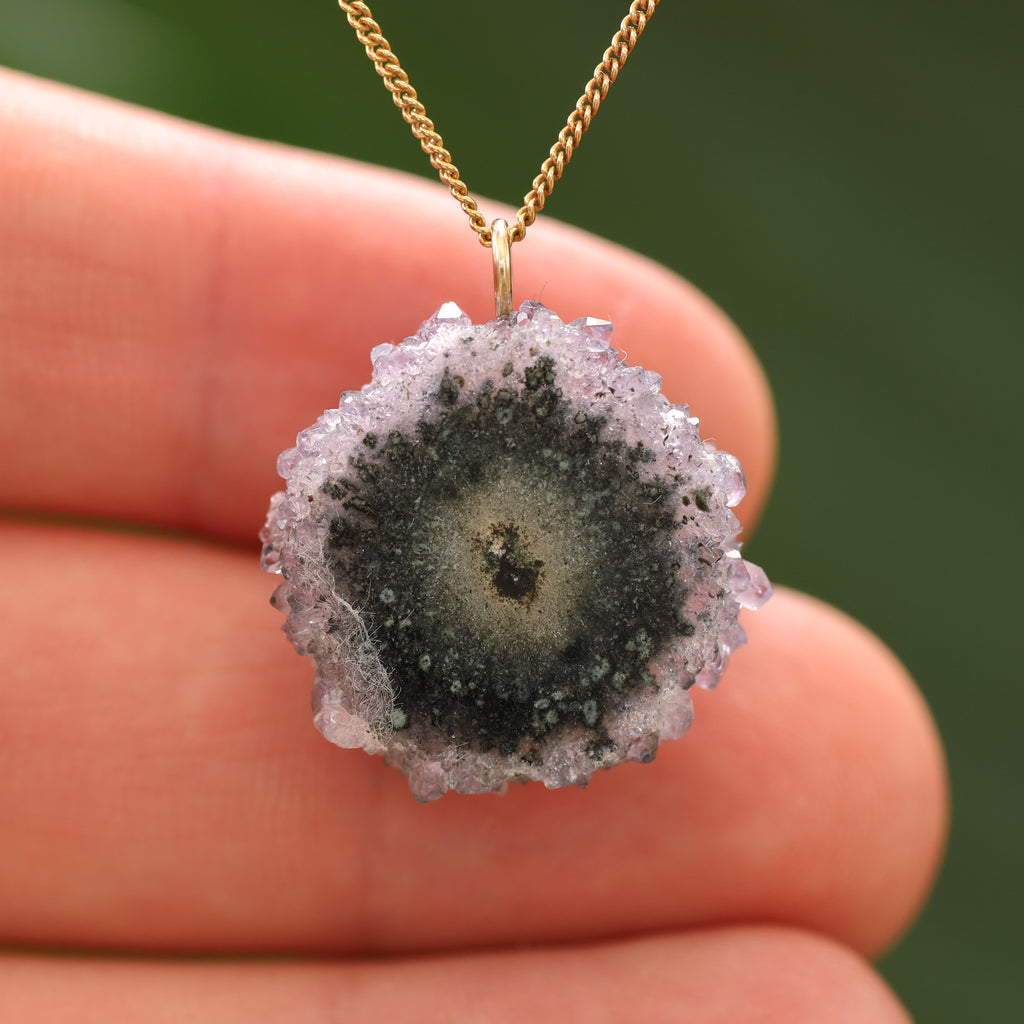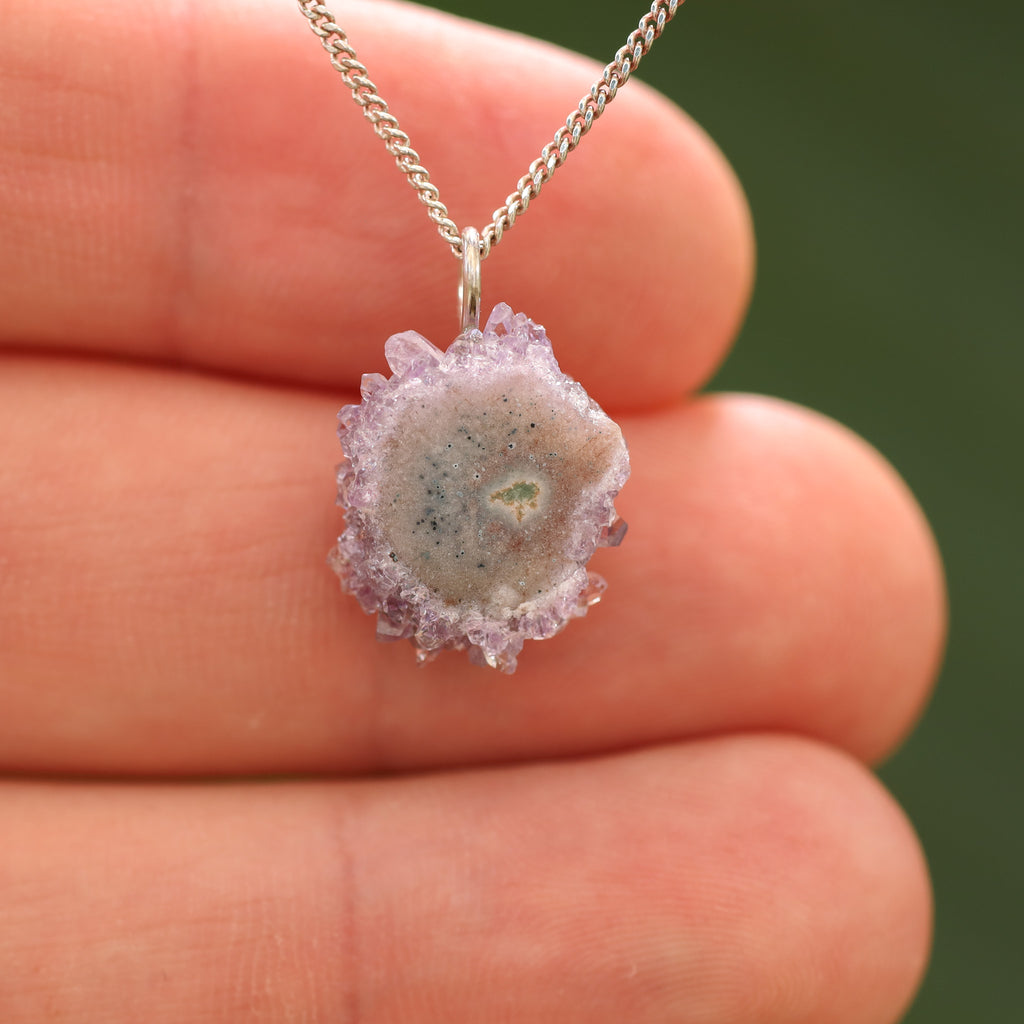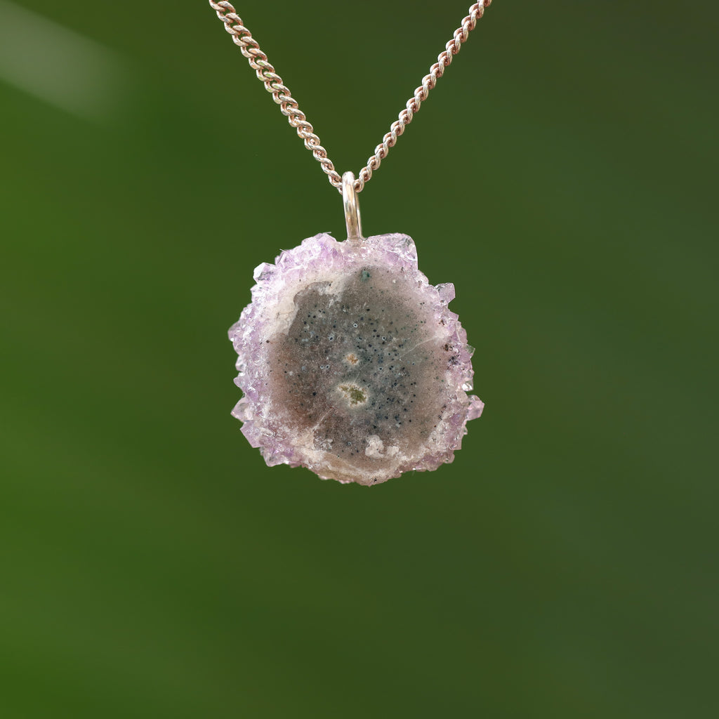 Een stalactiet is een druipgesteente dat aan het plafond van grotten ontstaat en wordt gevormd door mineralen die uit waterdruppels naar beneden vallen en verdampen. Veel stalactieten bestaan uit calciet, maar dit bijzondere schijfje van een stalactiet uit Uruguay bevat amethist, die over duizenden jaren kristalliseerde.