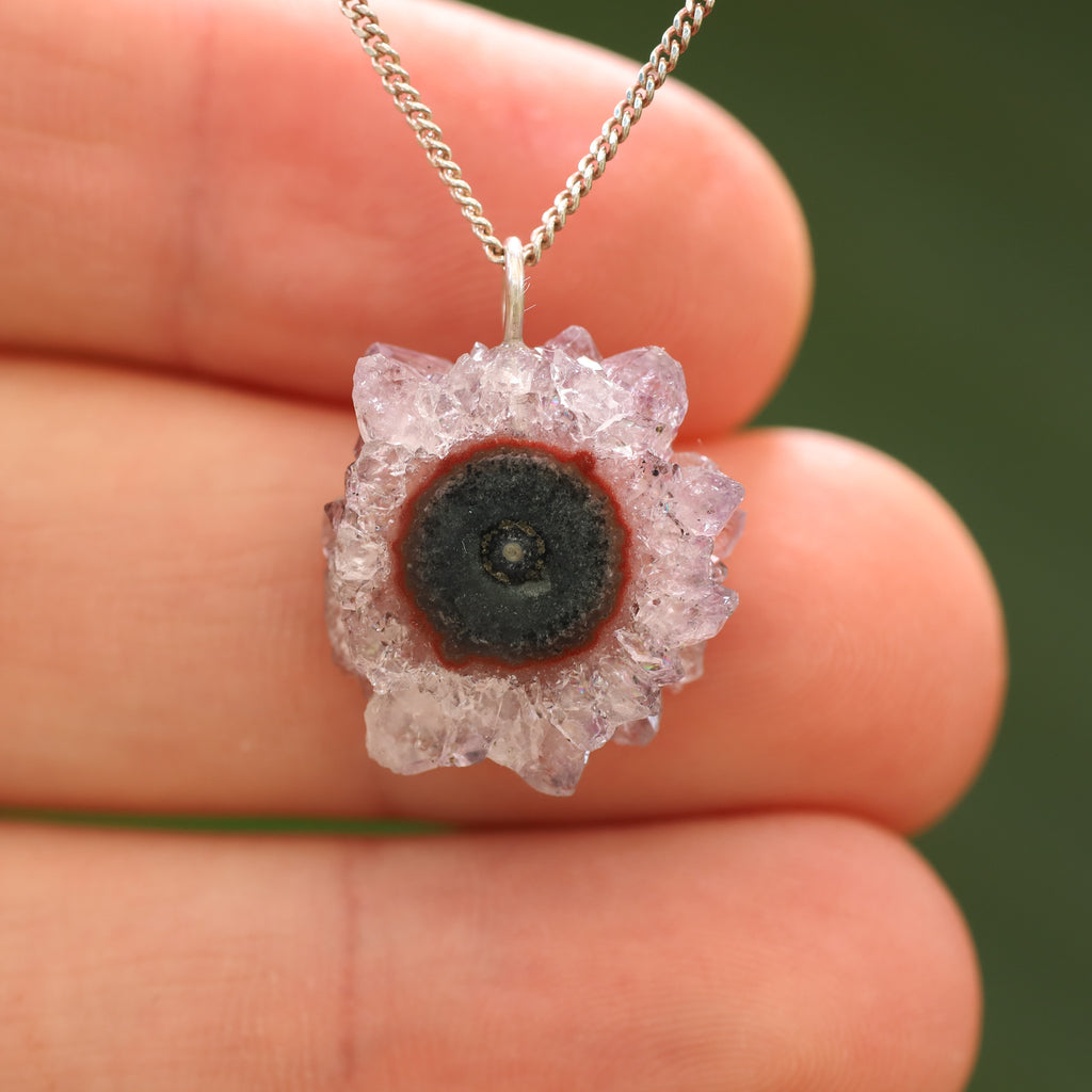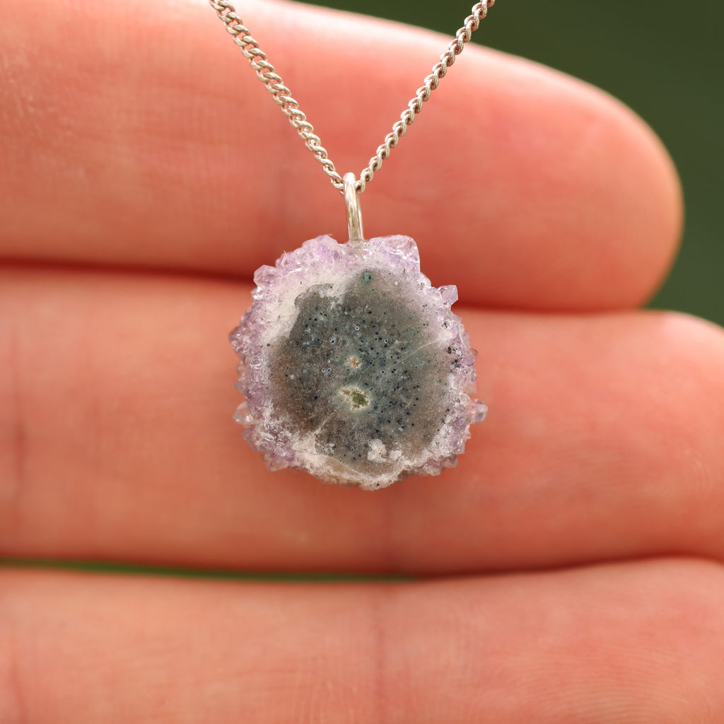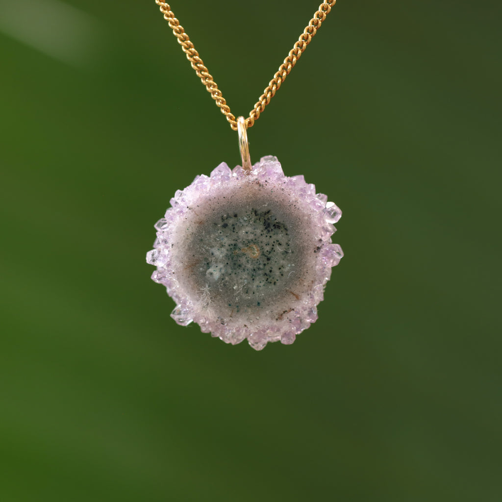 Een stalactiet is een druipgesteente dat aan het plafond van grotten ontstaat en wordt gevormd door mineralen die uit waterdruppels naar beneden vallen en verdampen. Veel stalactieten bestaan uit calciet, maar dit bijzondere schijfje van een stalactiet uit Uruguay bevat amethist, die over duizenden jaren kristalliseerde.