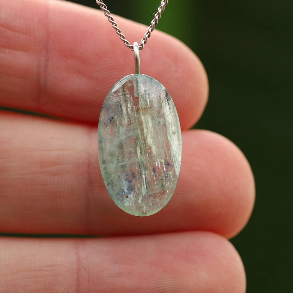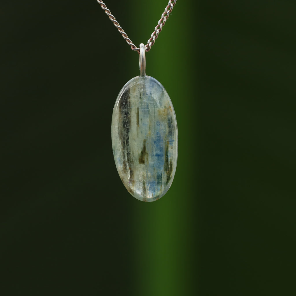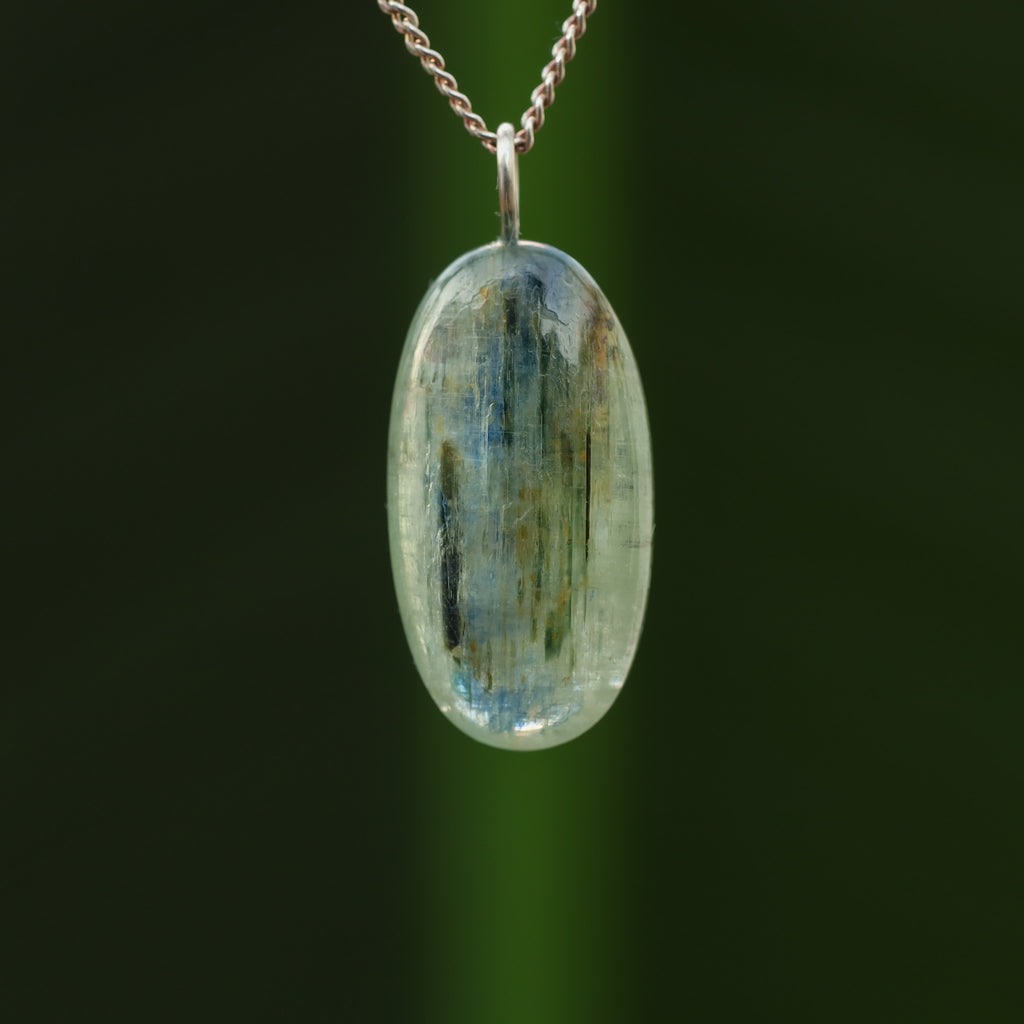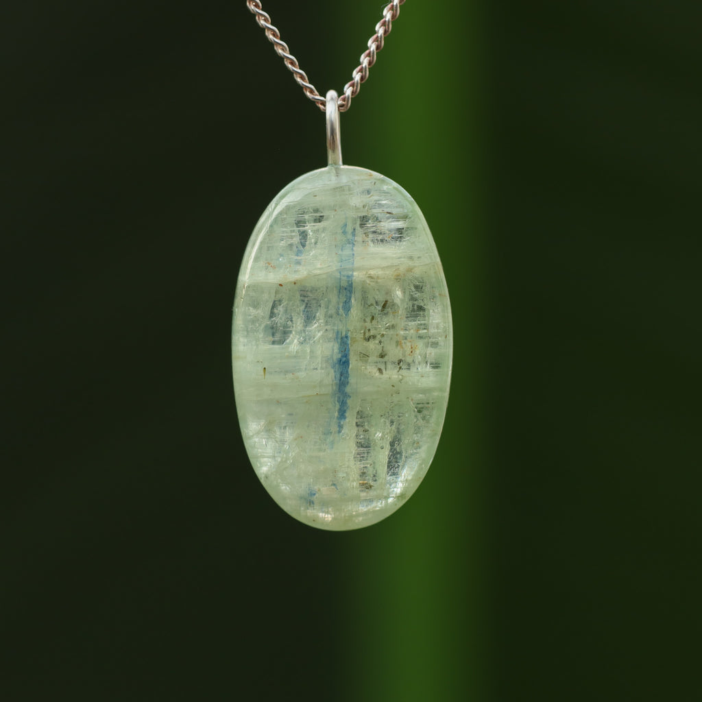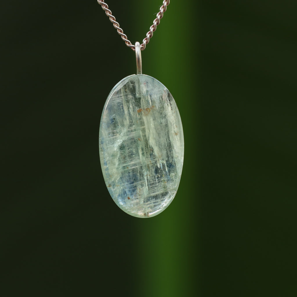 Groene Kyaniet staat bekend om zijn levendige, doorzichtige groene kleur en zijdeachtige glans. Dit mineraal, bestaande uit aluminiumsilicaat, behoort tot de kyanietfamilie. De groene kleur van deze kyaniet komt door sporenelementen van vanadium, in tegenstelling tot de blauwe variant waar ijzer en titanium aanwezig zijn.
