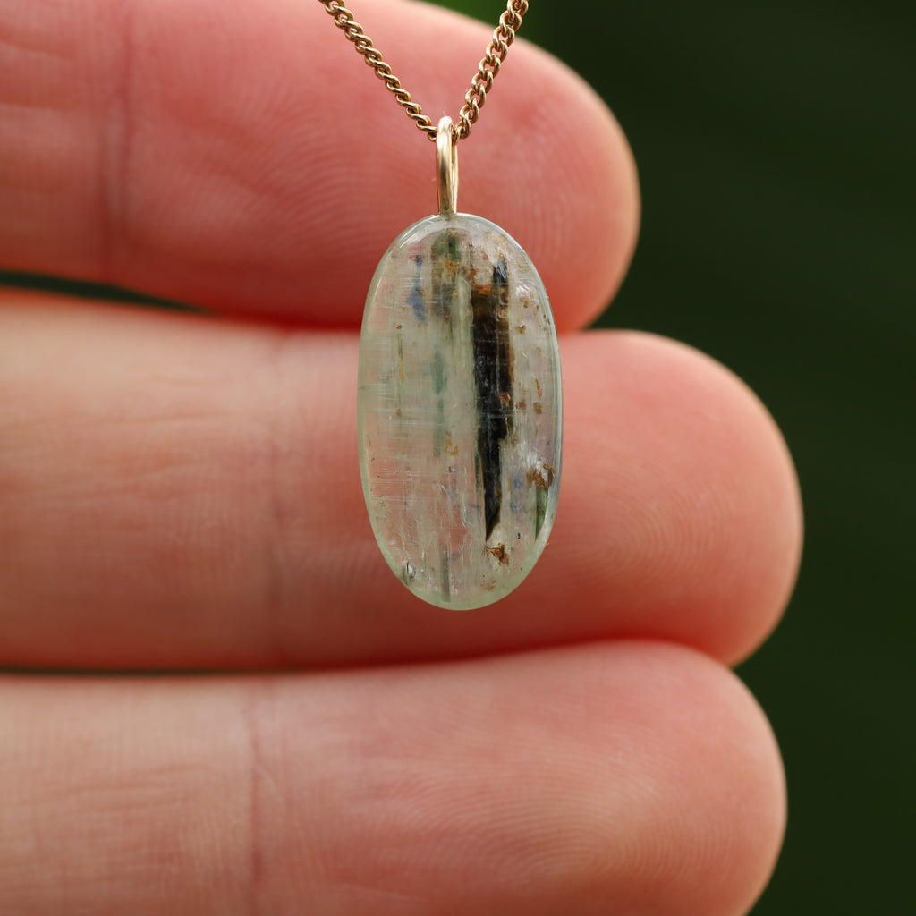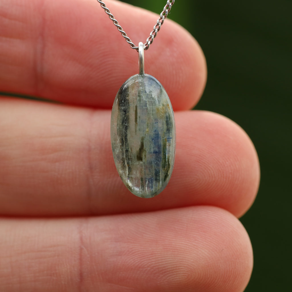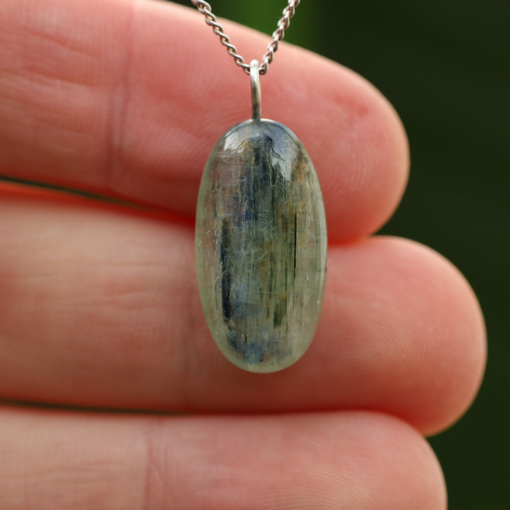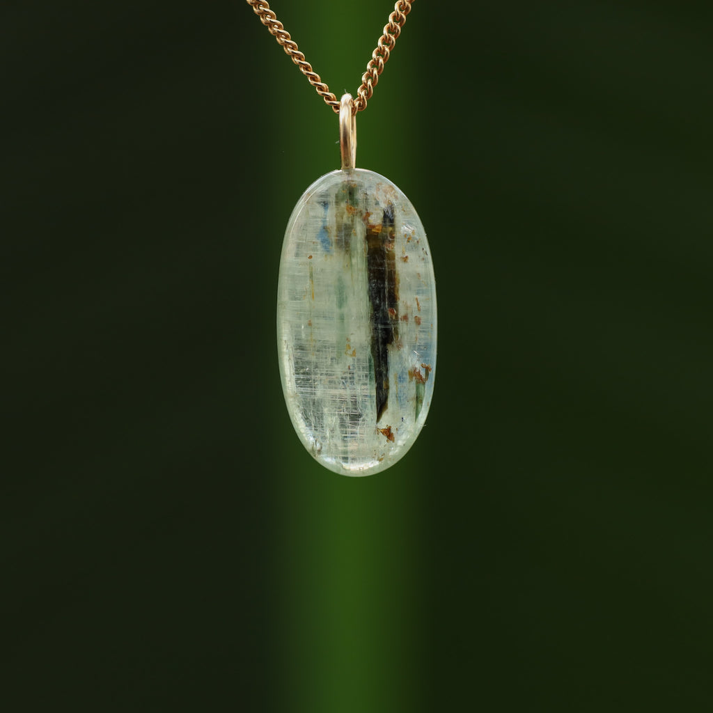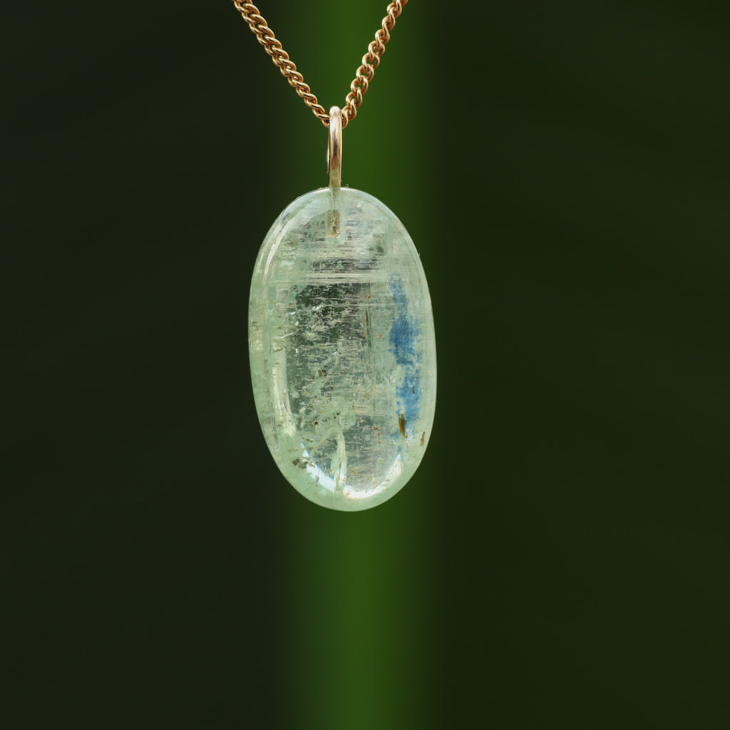 Groene Kyaniet staat bekend om zijn levendige, doorzichtige groene kleur en zijdeachtige glans. Dit mineraal, bestaande uit aluminiumsilicaat, behoort tot de kyanietfamilie. De groene kleur van deze kyaniet komt door sporenelementen van vanadium, in tegenstelling tot de blauwe variant waar ijzer en titanium aanwezig zijn.