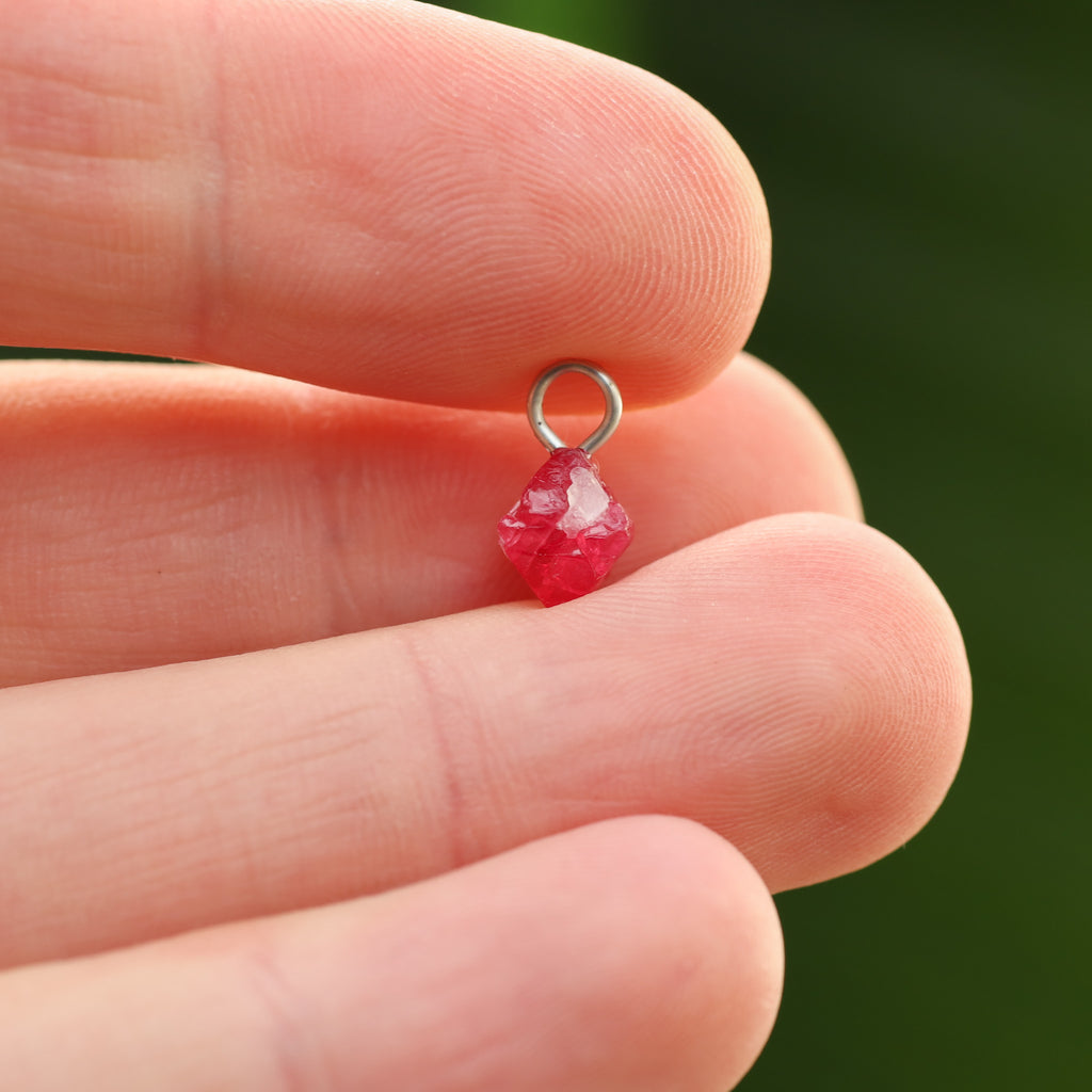 • Creatie: Vervolgens boren we met een diamantboor nauwkeurig een gaatje in elke steen, waarna we er een oogje aan vastmaken. Dit maakt het mogelijk om jouw sieraad te dragen zoals jij dat wilt - aan een ketting of als oorring.