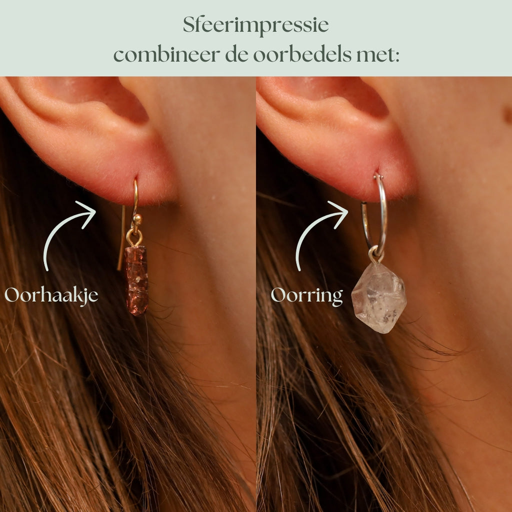 Van sommige edelstenen kunnen we mooie setjes oorbellen maken. We kiezen zorgvuldig twee edelstenen die goed bij elkaar passen, maar toch nét iets anders zijn. Elk setje is handgemaakt door ons. De oorbedels hebben een klein oogje, waardoor ze zowel met een oorhaakje als een oorring gecombineerd kunnen worden.
