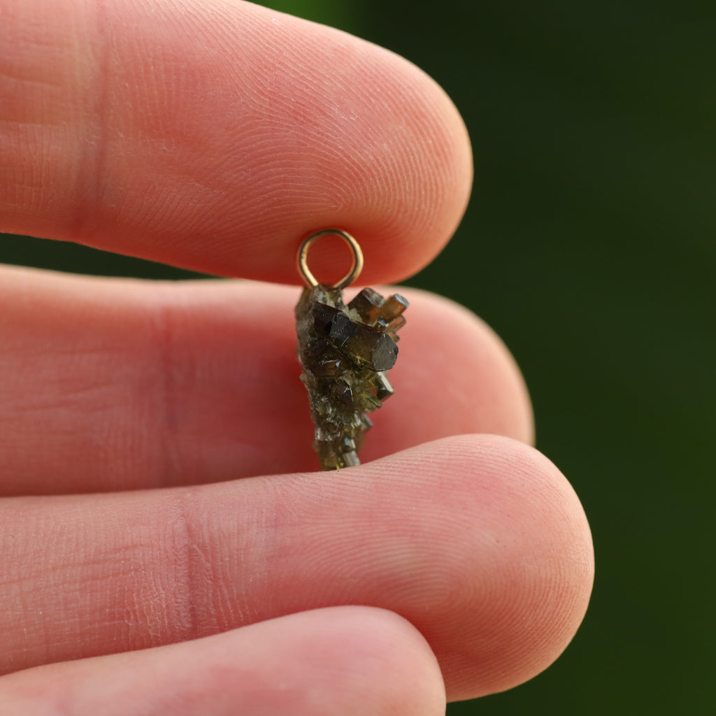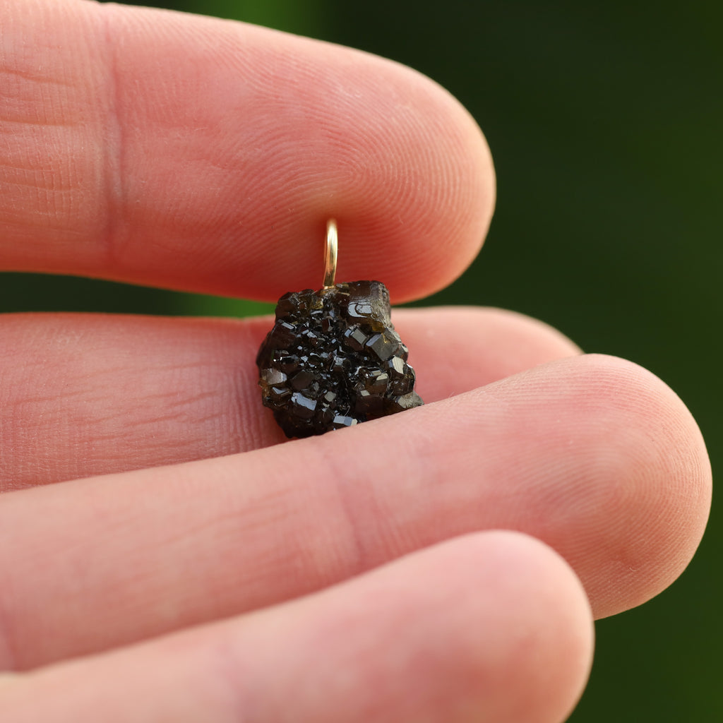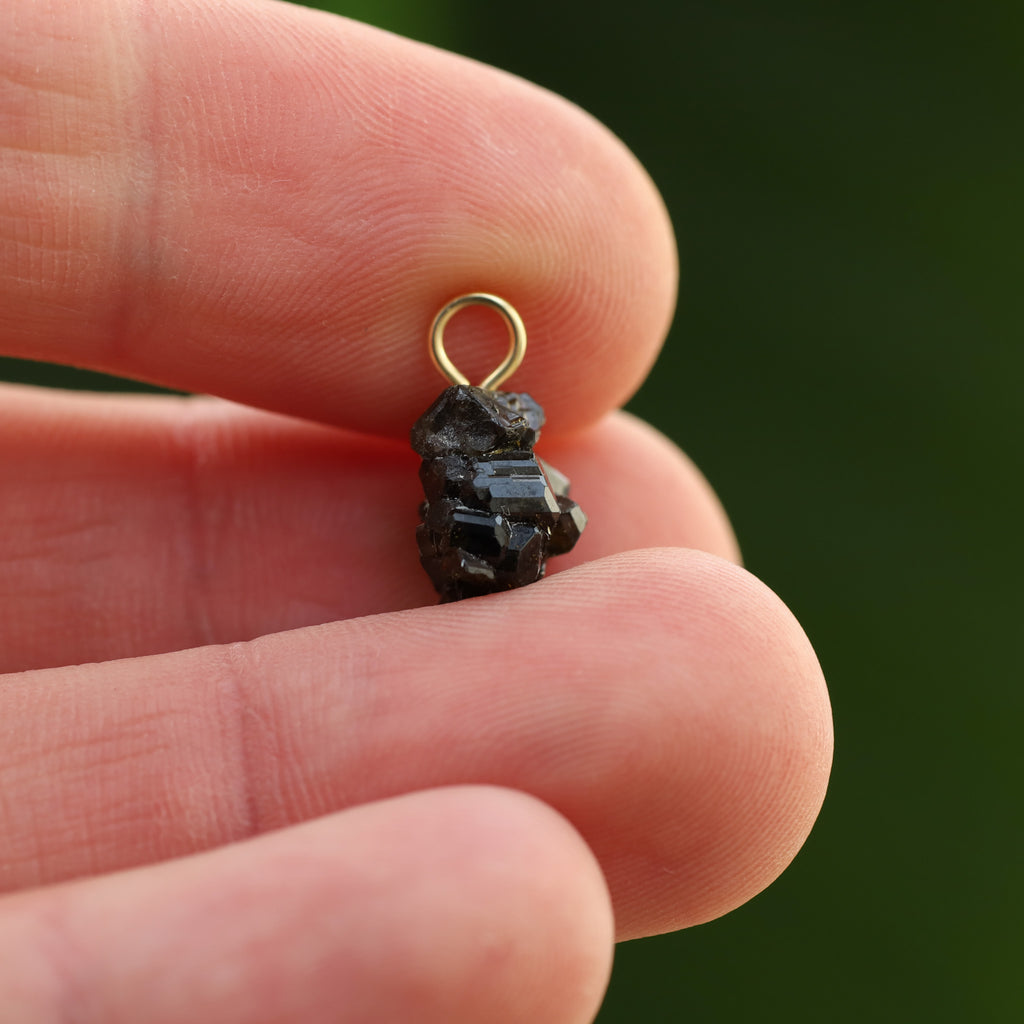 • Creatie: Vervolgens boren we met een diamantboor nauwkeurig een gaatje in elke steen, waarna we er een oogje aan vastmaken. Dit maakt het mogelijk om jouw sieraad te dragen zoals jij dat wilt - aan een ketting of als oorring.
