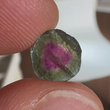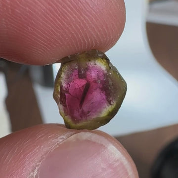 Toermalijn groeit van nature in langwerpige staafvormige kristallen. Wanneer grotere stukken worden gevonden, kunnen ze in dunne schijfjes worden gezaagd. Vooral bij exemplaren met een kleurverloop van binnen naar buiten komt dit prachtig tot uiting: de verschillende tinten laten zich dan in volle glorie zien. De zijkanten van deze schijfjes zijn ruw gelaten, waardoor je de natuurlijke groeirichting van het kristal goed kunt zien. Die lijnen langs de rand laten letterlijk zien hoe de steen in de aarde is gegroeid. Deze toermalijnschijfjes zijn afkomstig uit Afghanistan.